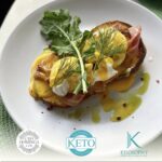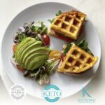 Un chaffle (waffle keto) con salmón ahumado, dos huevos escalfados, salsa Holandesa, aceitunas, alcaparra, cebolla morada y rucola.