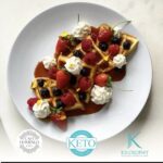 Chaffle con fresa, frambuesa y arándanos, chantilly de vainilla, salsa de caramelo keto.